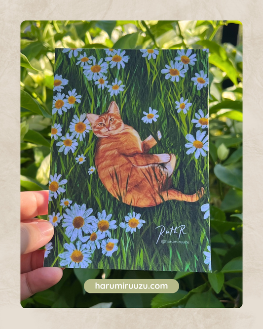 “Cat in a Daisy Field” Glitter Laminated Art Print - Original Art by Ruth Santos Regalado
